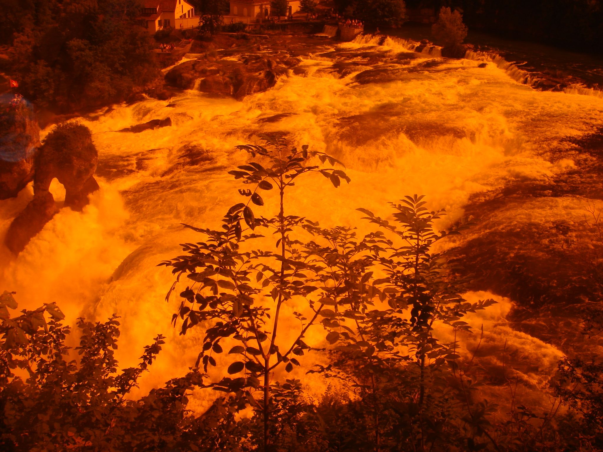 Der Rheinfall durch eine Buntglasscheibe im obersten Känzeli fotografiert.