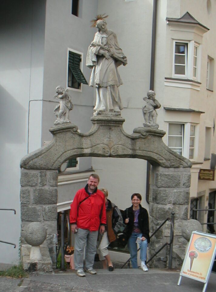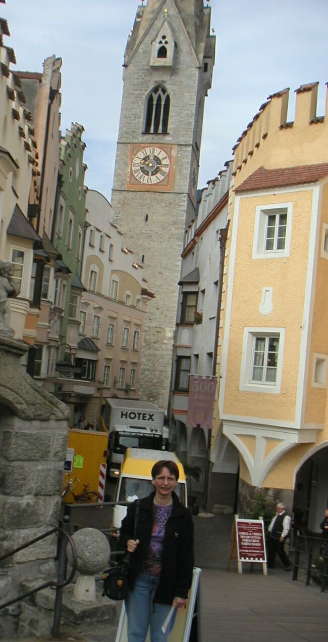 Dank einer etwas falschen Auskunft des Wirtes über die Zugverbindungen ist der ganze Vormittag einem ausgiebigen Stadtbummel (inklusive Zeitung lesen und Computertippen) vorbehalten. Ulla vor dem weißen Turm, dem Wahrzeichen von Brixen