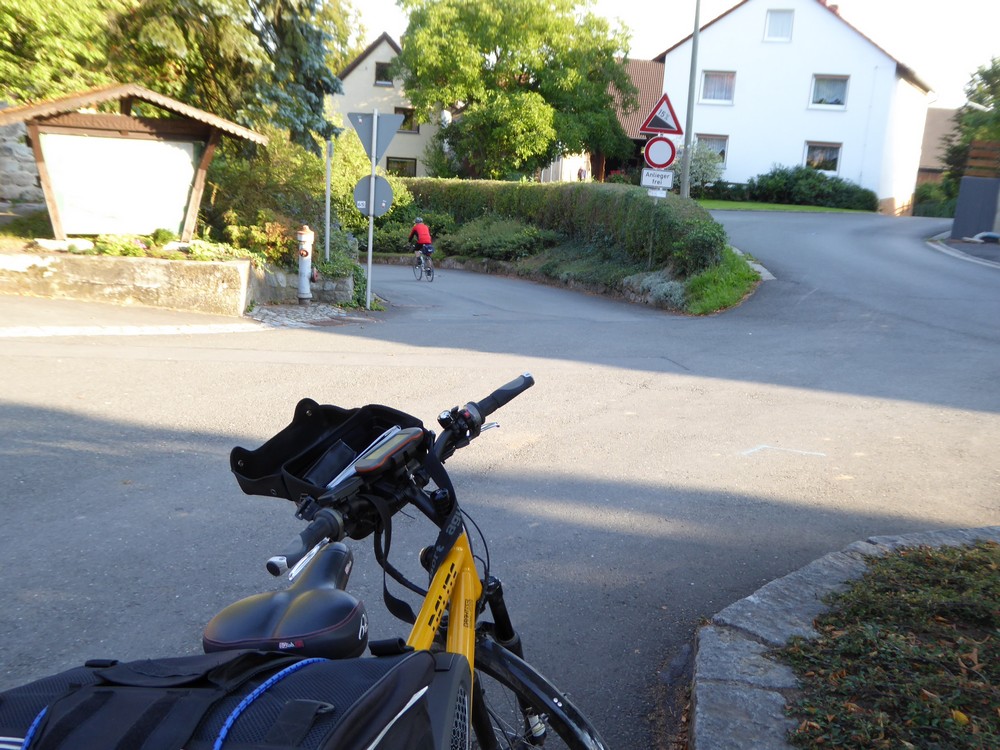 Abendstimmung in Michelau ----- Dann noch ein kleiner Zwischenfall nach dem leckeren Abendessen um 21.50 Uhr: Rolf bekam noch einen Schnaps. Zu Franz sagte der (etwas müde) Wirt: "Bier gibt's nicht mehr, wir schließen um 22 Uhr. Holen Sie sich oben was aus dem Automaten." |