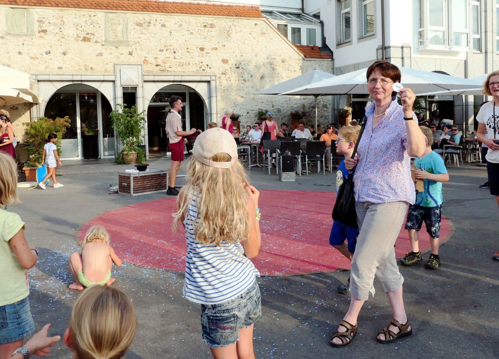 Ulla bekommt einen Button für ihre Straßenkünstlerspende Die kamen aus dem Argentinien in Afrika. |