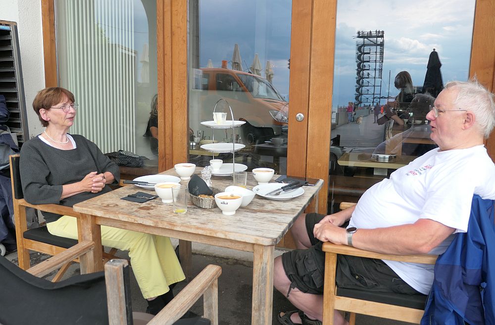 Die meisten frühstücken drinnen - wir nicht!!! - Wir sind vor der Tür. Der Moleturm spiegelt sich im Glas. |