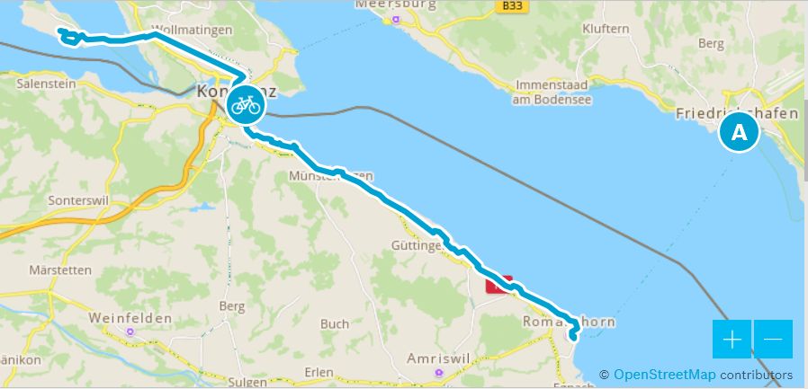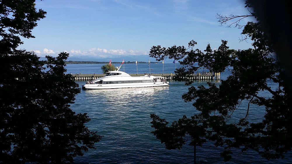 Dann mit der Fähre nach Romanshorn und von dort ohne zu rasten mit dem Rad 32 km bis auf die Reichenau. Das Bosch-NAVI Nyon versagte wie schon in letzten Offensichtlich nutzen Beschwerden bei der Fa. Bosch nichts. Leider waren für uns auf dem Hochwart alle Schattenplätze vergeben. Also zurück mit dem Konstanze nach Friedrichshafen. |