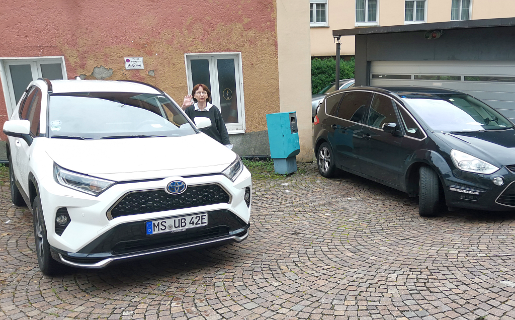 Das obligatorische Foto von der Abfahrt: Ullas neues PlugIn-Hybrid-Auto (Der Anschluss für die Wallbox liegt schon!) |