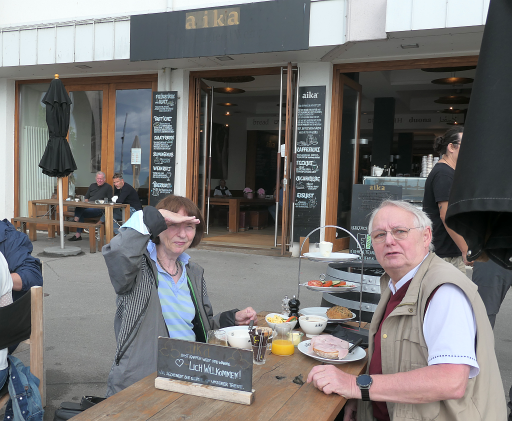 Zum ersten Mal in diesem Jahr: Sonnenfrühstück bei aika Im Hintergrund der Chef |