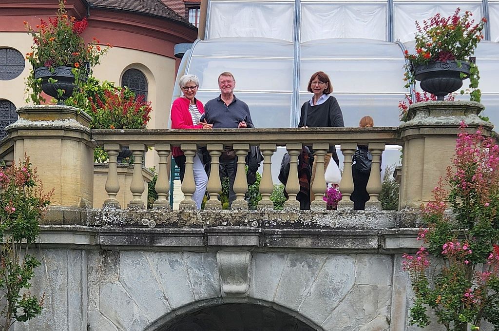 Die drei betrachten den Rosengarten. |