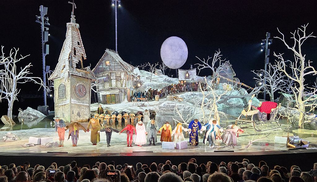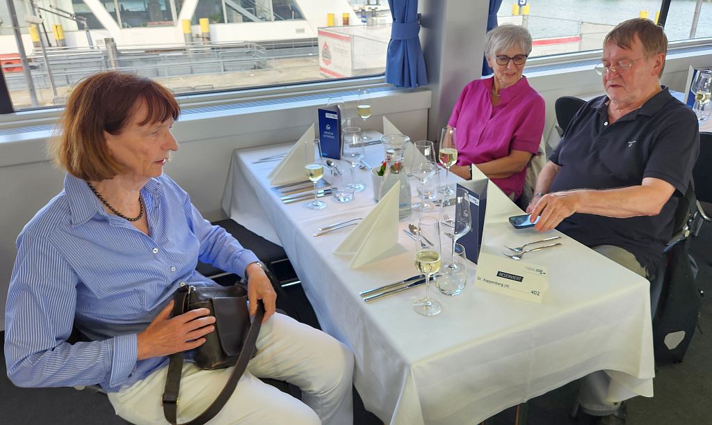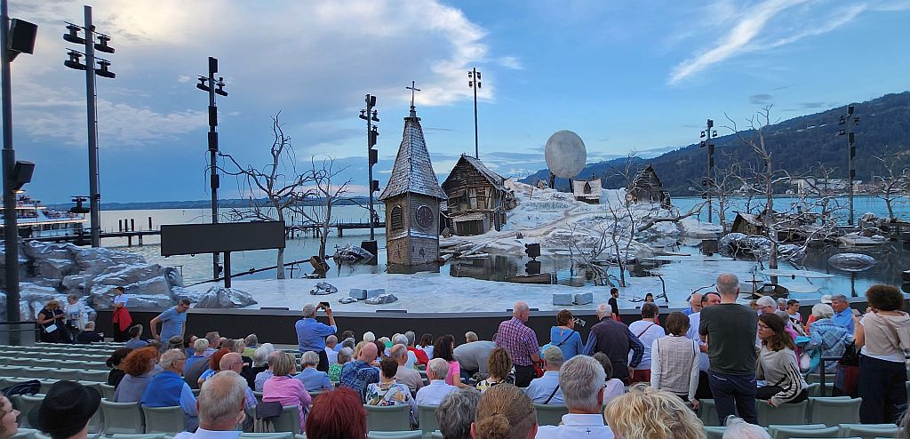 ![]() Auf die Räder - zum Schorsch ![]() Ulla hörte es schon donnern - kaum waren wir zurück, da goss es kurz in Strömen. Als der Regen aufgehört hatte, gab es Kaffee vor dem Spitalkeller mit den beiden Frauen vom Straßentheater Muy Arriba Company (AR). Dann auf zum "Freischütz" von Carl Maria von Weber mit der Graf Zeppelin und dem obligatorischen Kapitänsdinner. Die Getränke wurden diesmal nicht extra berechnet. ![]() Das Fotografieren der romantischen, mittelalterlichen, spektakulären und fast mystischen Inszenierung war wie immer verboten. Hier eine Aufnahme vor der Aufführung ... ![]() ... und vom Schlussapplaus. ![]() Nach der Rückfahrt mit dem Mitternachtssüppchen gab es separate Absacker. |