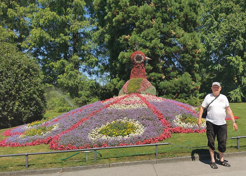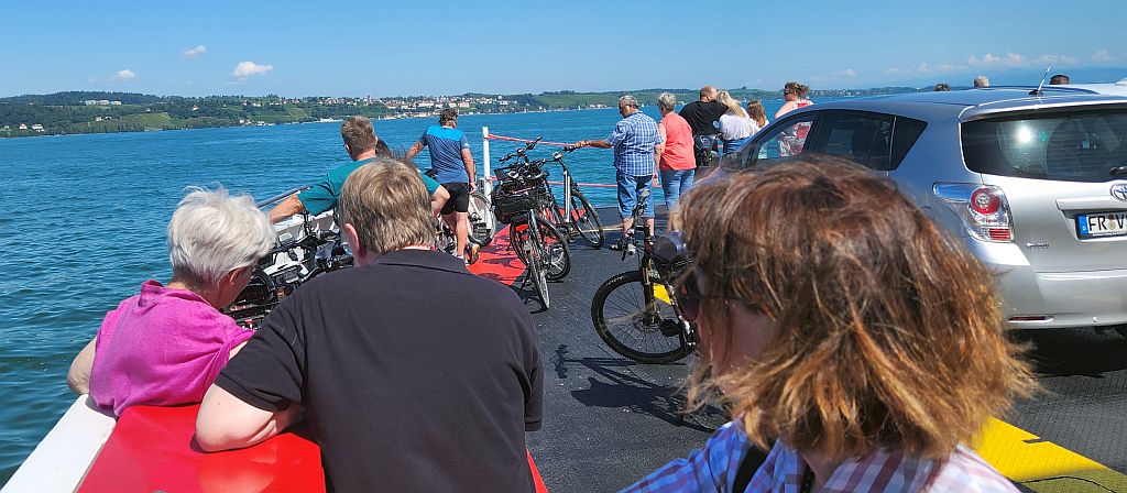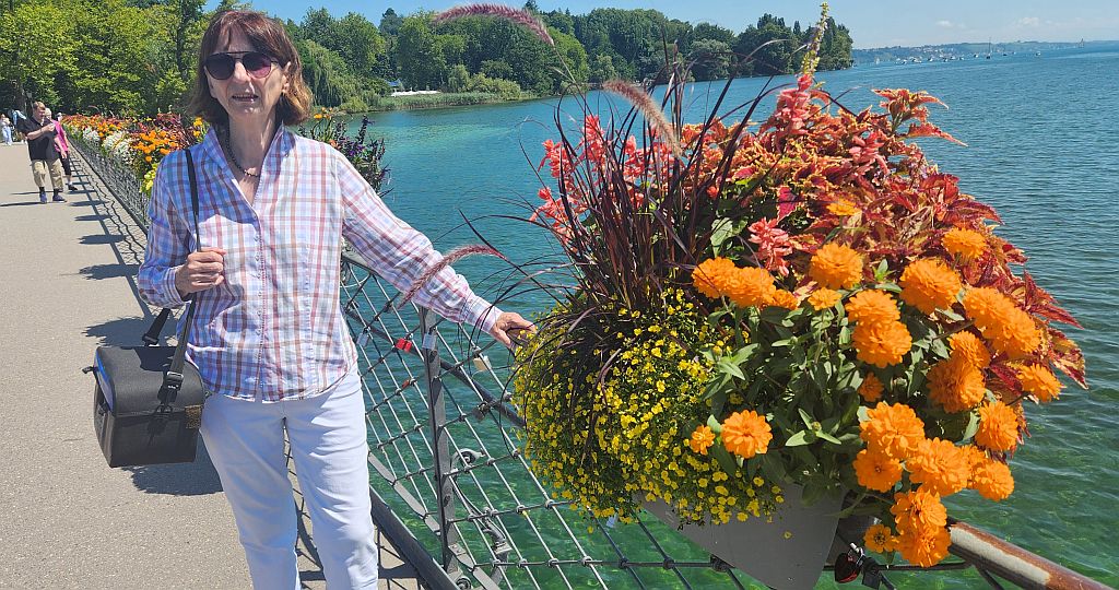 Ulla ist verdutzt ob des Blumenbouquets ![]() Dann endlich ... ![]() .... Ullas Blumenbegrüßung forever ![]() ![]() und der Pfau mit Pfranz ![]() Wegen der starken Sonneneinstrahlung verkürztes Insel-Programm: MfM (Mainau für Memmen) Mit dem Rad ging es zurück nach Staad auf die Fähre und von dort mit starrem Blick auf Meersburg: ![]() Einkehr wieder bei Schorsch, damit der Weg nicht zu lang wurde. Abendessen und Absacker bei den Grünewalds |