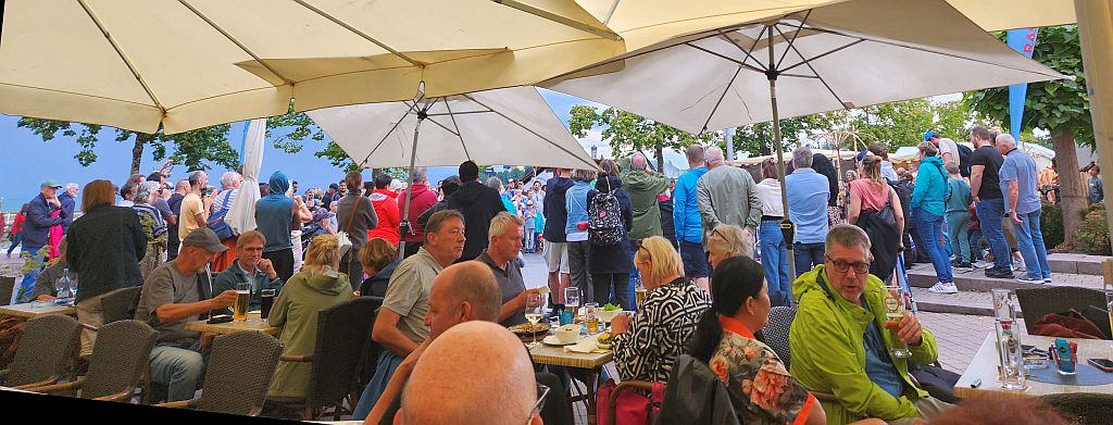 Abendessen beim Spitalkeller mit sehr vielen Zuschauern bei den Staßenkünstlern. Mit dem Regen wurde es weniger, bis wir aus Angst vor dem angekündigten Gewitter die einzigen verbliebenen Gäste waren, die sogar das Seil um Tisch und Stühle selber anlegten und abschlossen. |