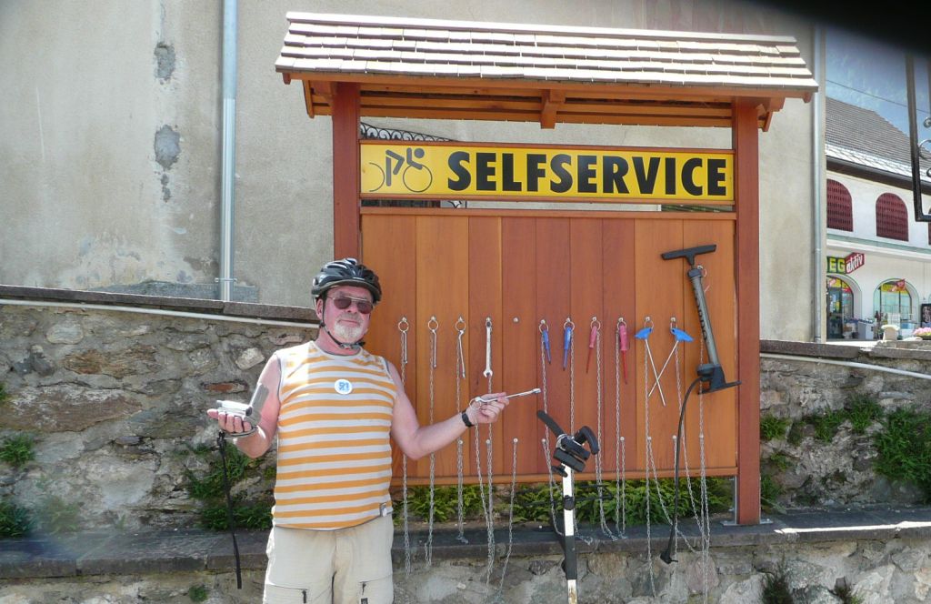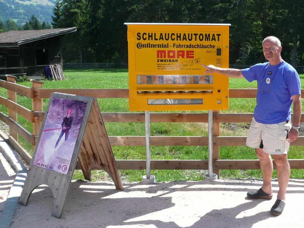 wieder lebendig worden. Zur Stärkung mussten die Tangoboys noch Powerdrinks kaufen. Jürgen zu Eckhard: "Du sorgst für mich wie eine Mutter". Darauf die junge Kassiererin:" Ja, aber ohne Zitzen!" Unterwegs, kurz vor dem steilen Anstieg bei Tratten wollte Franz den "Gummiautomaten" fotografieren: Beim Absteigen machte es Raaatschsch und seine Hose war hin...