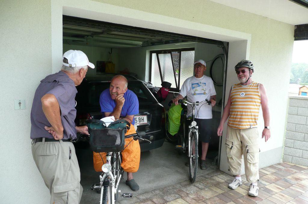 Fast hätte es heute kein weiteres Foto gegeben - aber in Erlenhof geschah noch ein kleines Missgeschick. Nach dem Begrüßungstrunk (0,5 l = 2,70 €) wollten wir noch ein kleines (0,3 l = 2,40 €) bestellen. Die Kellnerin fragte nochmals nach: "Durchsichtige?". Franz antworte: "Keine Trüben!! Keine Zwickel". Dann kam die Kollegin allerdings mit 5 Obstlern und für die meisten Tangoboys mit 4 "Greif". Als wir protestierten und Bier haben wollten drehte sie sich um und wollte gehen. Aus Mitleid riefen wir "Ach - wir trinken die doch". Dadurch war sie so durcheinander, dass zwei der Obstler auf dem teuren ODLO- Hemd von Klaus landeten und Ulf sofort bei Klaus lutschen wollte. Die nasse Schulter ist leider nicht gut zu erkennen.