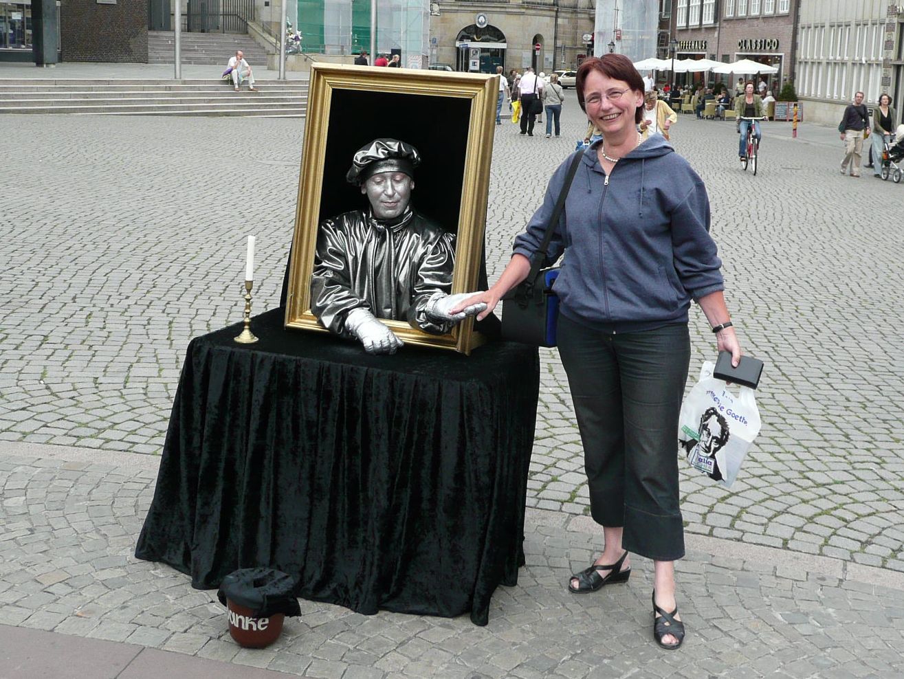 Ulla beobachtet sehr lange auf dem Marktplatz einen Pantomimen, der sich nur gegen Geld ablichten lässt.