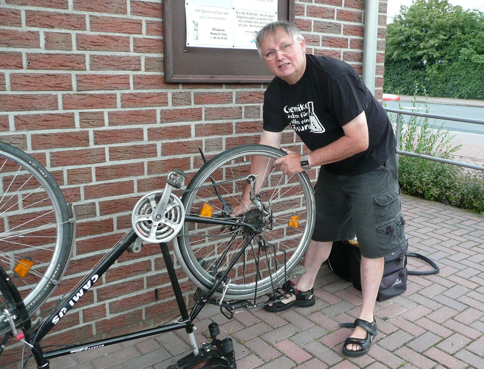Schwupp-di-wupp sind die Hände dreckig aber das Hinterrad wieder drin. 3. Wir trafen am Melkhus Radfahrer, die einen "Engel"hard bei sich hatten und unsere Pelerinen betrachteten, als kämen wir vom Maskenball. Sie waren auf der anderen Weserseite gefahren und hatten (noch) keinen Regen gehabt. 4. Als wir nach Elsfleth wollten, war die Straße über die Hunte hoch geschwenkt - "Runterschwenken" der Brücke gibt es nur zwischen 7 und 20 Uhr und nur zu jeder vollen Stunde